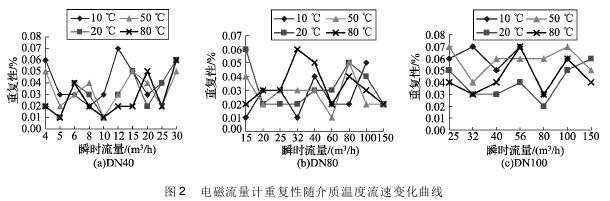 將實(shí)驗(yàn)測(cè)得的環(huán)保污水專用流量計(jì)在不同溫度及流速下的重復(fù)性數(shù)據(jù)整理,特性曲線如圖2所示,3組曲線分別對(duì)應(yīng)DN40、DN80、DN100的3塊環(huán)保污水專用流量計(jì)的重復(fù)性曲線。