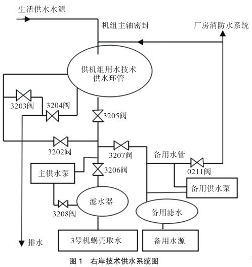 大化電廠技術(shù)供水包括右岸和左岸供水,本文以右岸 3 號(hào)機(jī)技術(shù)供水系統(tǒng)增設(shè)帶現(xiàn)場(chǎng)顯示高壓電磁流量計(jì)技術(shù)改造方案為例進(jìn)行分析說明。右岸技術(shù)供水系統(tǒng)(見圖 1)由各機(jī)組單元蝸殼取水主水源、濾水器、主供水泵、正反向切換閥(3202 閥與 3204 閥開為反向取水,3203 閥與 3205閥開為正向取水,運(yùn)行時(shí)只開其中一種)、備用水源、備用濾水器、備用供水泵和備用總水管構(gòu)成一個(gè)整體,并通過 0211 閥與廠房消防水系統(tǒng)相連接,可通過主水源自流供水、主水源水泵增壓供水、備用水源自流供水、備用水源水泵增壓供水等不同供水方式向機(jī)組推力軸承冷卻器和發(fā)導(dǎo)軸承冷卻器、水導(dǎo)軸承冷卻器、發(fā)電機(jī)空氣冷卻器提供冷卻水源。機(jī)組技術(shù)供水正常運(yùn)行采用單元蝸殼取水的供水方式運(yùn)行,以備用水源供水為輔。機(jī)組主軸密封用水分別取自生活供水水源和技術(shù)供水備用總管水源,向機(jī)組大軸提供可調(diào)水壓端面密封水源。在現(xiàn)場(chǎng)配置一個(gè)技術(shù)供水現(xiàn)地單元柜,實(shí)現(xiàn)對(duì)機(jī)組技術(shù)供水系統(tǒng)設(shè)備自動(dòng)控制、故障保護(hù)及報(bào)警。柜內(nèi)配置可編程 PLC 控制系統(tǒng),電控柜對(duì)主供增壓泵、3202 至 3208 電動(dòng)碟閥進(jìn)行流程控制。