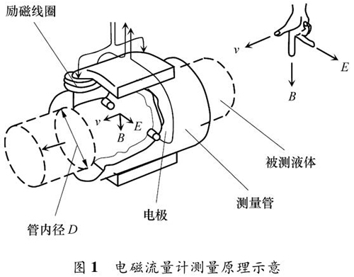 液體流量計(jì)的測量原理如圖 1 所示。根據(jù)法拉*電磁感應(yīng)定律,導(dǎo)電液體在磁場中流動(dòng)會(huì)產(chǎn)生電動(dòng)勢 E,它與磁感應(yīng)強(qiáng)度 B、導(dǎo)電液體平均流速 v 成一定比例關(guān)系:
