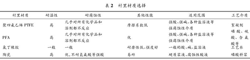 液體流量計(jì)要根據(jù)被測流體的溫度、壓力、速度以及含固顆粒的硬度、含量和粒徑大小來決定測量管內(nèi)襯的材質(zhì)。該濕法磷酸裝置中,液體流量計(jì)測量管襯里材質(zhì)的種類見表 2。