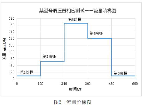 該測試主要利用實驗室測試條件,模擬客戶現(xiàn)場使用情況。其主要測試內(nèi)容包括:測試電磁流量計在+23℃,-30℃和-40℃三種溫度下,電磁流量計出口壓力分別在2.1kPa和30kPa時,流量分別從*1階梯到*5階梯時的響應速度,客戶所提供的流量階梯如圖2所示。橫軸表示下游球閥開啟動作時間,縱軸表示高溫電磁流量計下游需要的流量q。