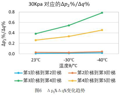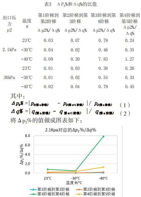 為了更直觀嚴謹?shù)膶Ρ让總€階段響應速度的不同,對原始數(shù)據(jù)進行處理,得到如下表格2和表格3。將△p2%/△q%作為響應速度的直觀量化表達,若△p2%/△q%的值大,說明單位流量變化照成的出口壓力變化大,即說明電磁流量計響應相對較慢,反之亦然。