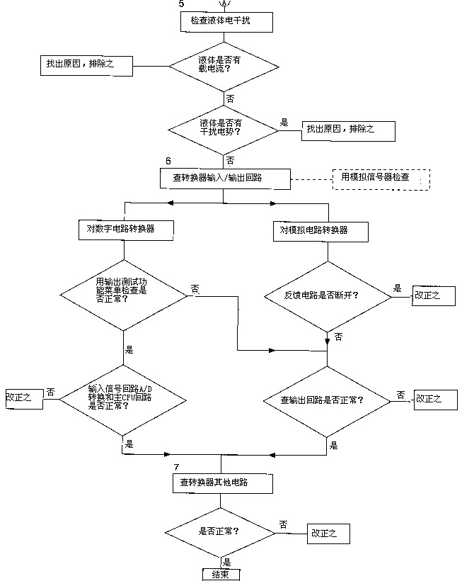 先在管系和流量傳感器內(nèi)通水,靜止無流動狀態(tài)下將轉(zhuǎn)換器兩信號端子和功能地或保護(hù)地端子短路,觀察轉(zhuǎn)換器輸出信號足否到零。若能到零,則可初步判斷故障在轉(zhuǎn)換之前而不在轉(zhuǎn)換器本身及后位儀表,下一步可先重點檢查連接電纜和傳感器(即流程圖*2項);若不能到零,則檢查重心應(yīng)在轉(zhuǎn)換器和后位儀表(即流程圖*3、4、6、7項)。